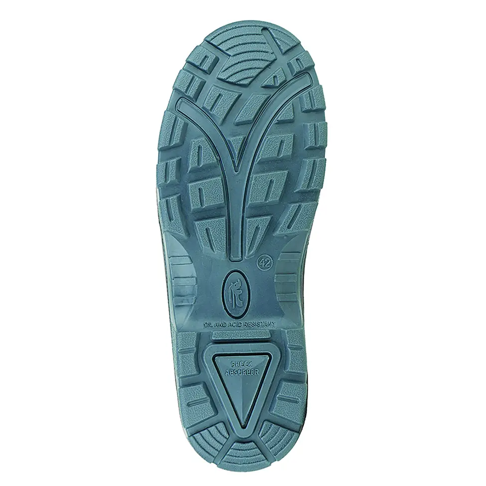 Двухслойная маслобензостойкая полиуретановая подошва литьевого метода крепления имеет вставку в пяточной части подошвы, обладающую амортизационными свойствами и способную гасить ударные нагрузки при ходьбе.