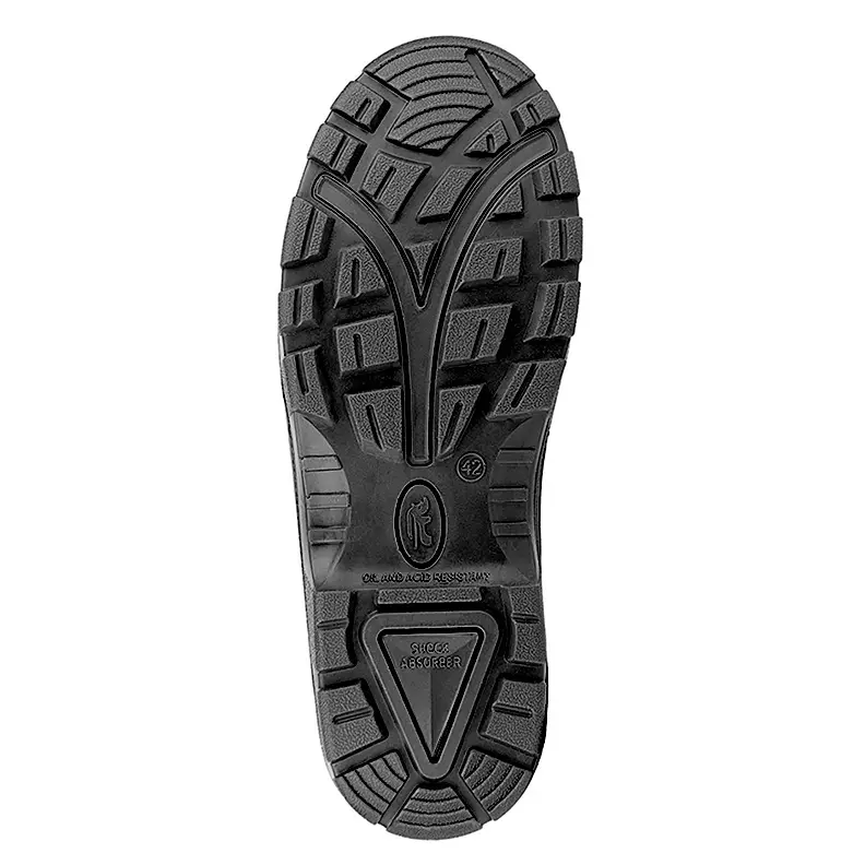 Однослойная маслобензостойкая полиуретановая подошва литьевого метода крепления имеет вставку в пяточной части подошвы, обладающую амортизационными свойствами и способную гасить ударные нагрузки при ходьбе.