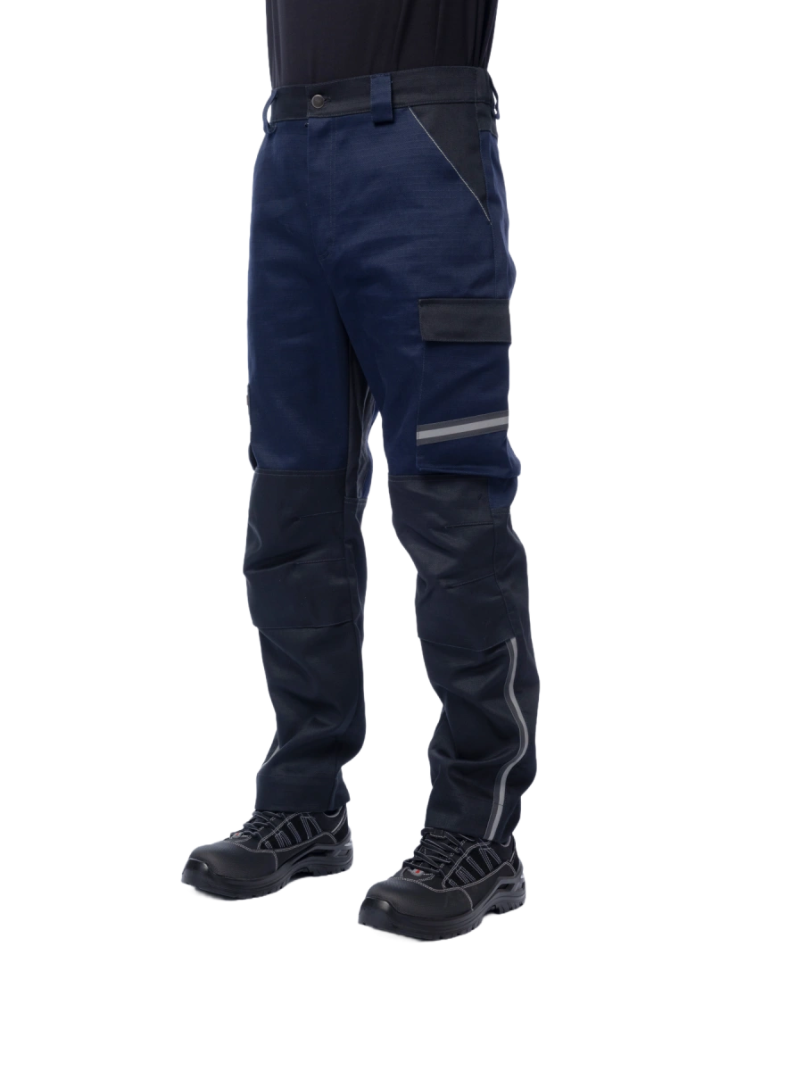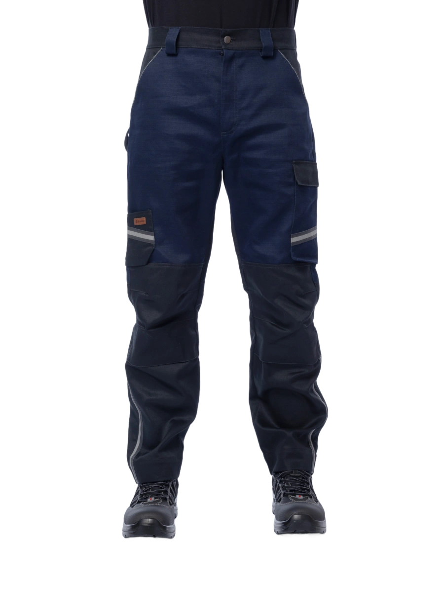 Ткань с пропиткой по технологии Proban, устойчива к искрам и брызгам расплавленного металла Термостойкая фурнитура Ткань рип-стоп прочная на разрыв Лёгкий вес изделия Эргономичный крой Частично эластичный пояс 2 боковых кармана, набедренный карман с клапаном, задний карман с клапаном, карман для инструментов, отделения для расходных материалов, петля для подвеса инструментов Ластовица для удобства движений Отделения под наколенники Регулировка по низу брюк с помощью кнопок Удлинение брюк на 5 см Светоотражающие ленты Маркировка для ФИО на вшивной этикетке