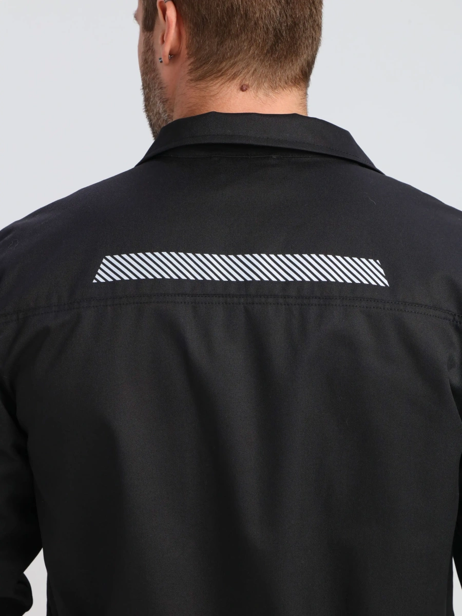 - Светоотражающие элементы: сегментированные термоленты на нагрудных кокетках и спинке, а также кант в локтевых швах для безопасности в условиях недостаточной видимости