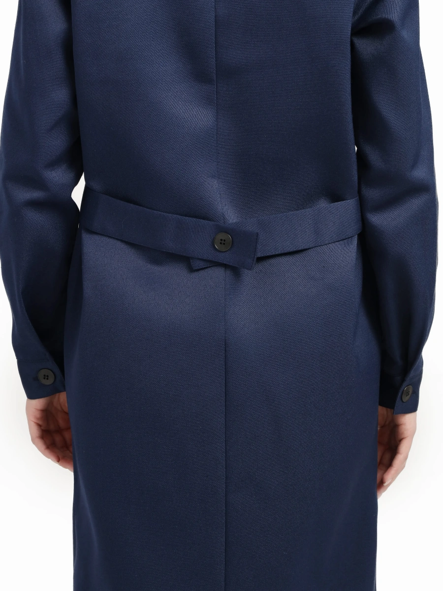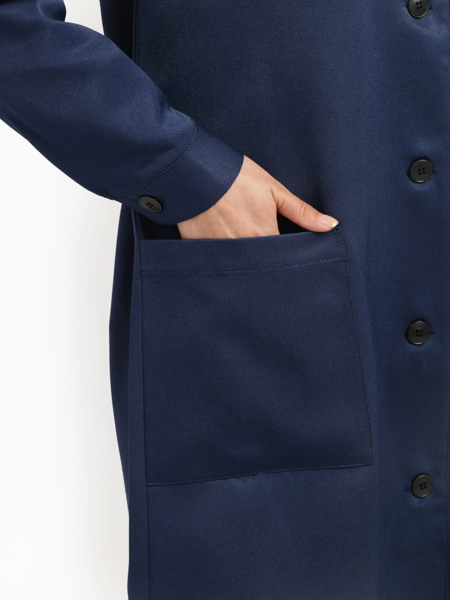 - Классический прямой силуэт ниже колена с застежкой на пять петель и пуговиц