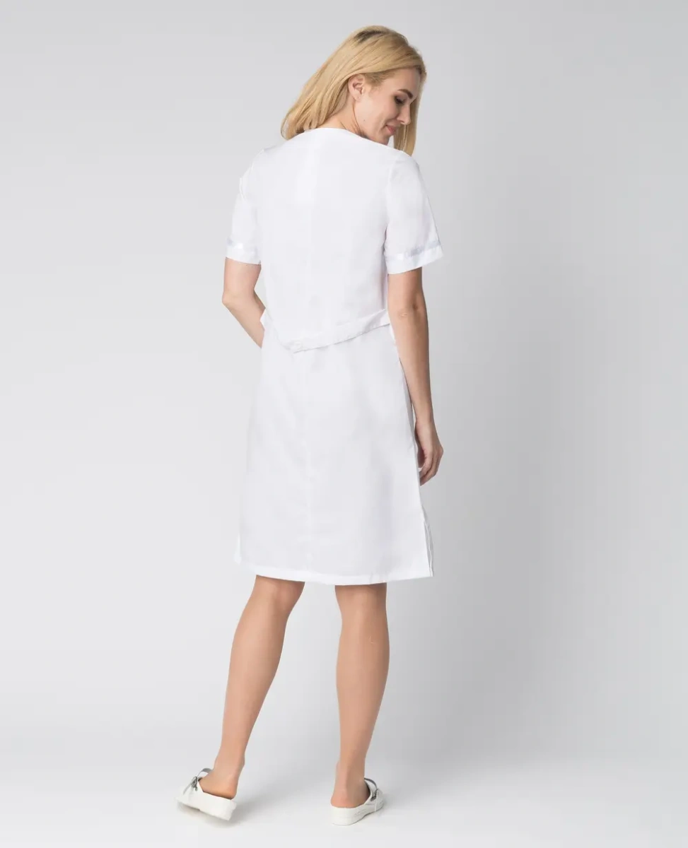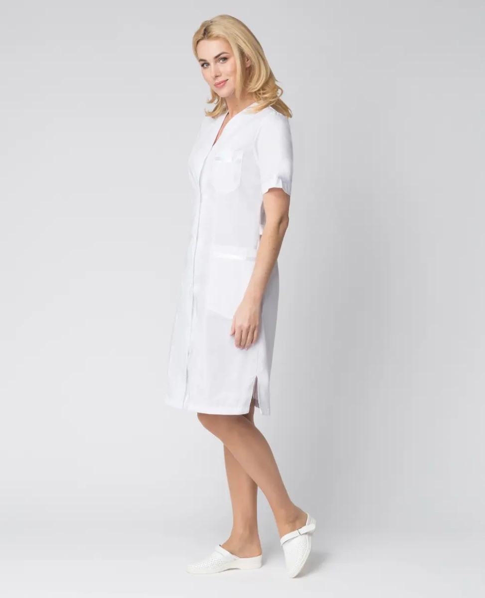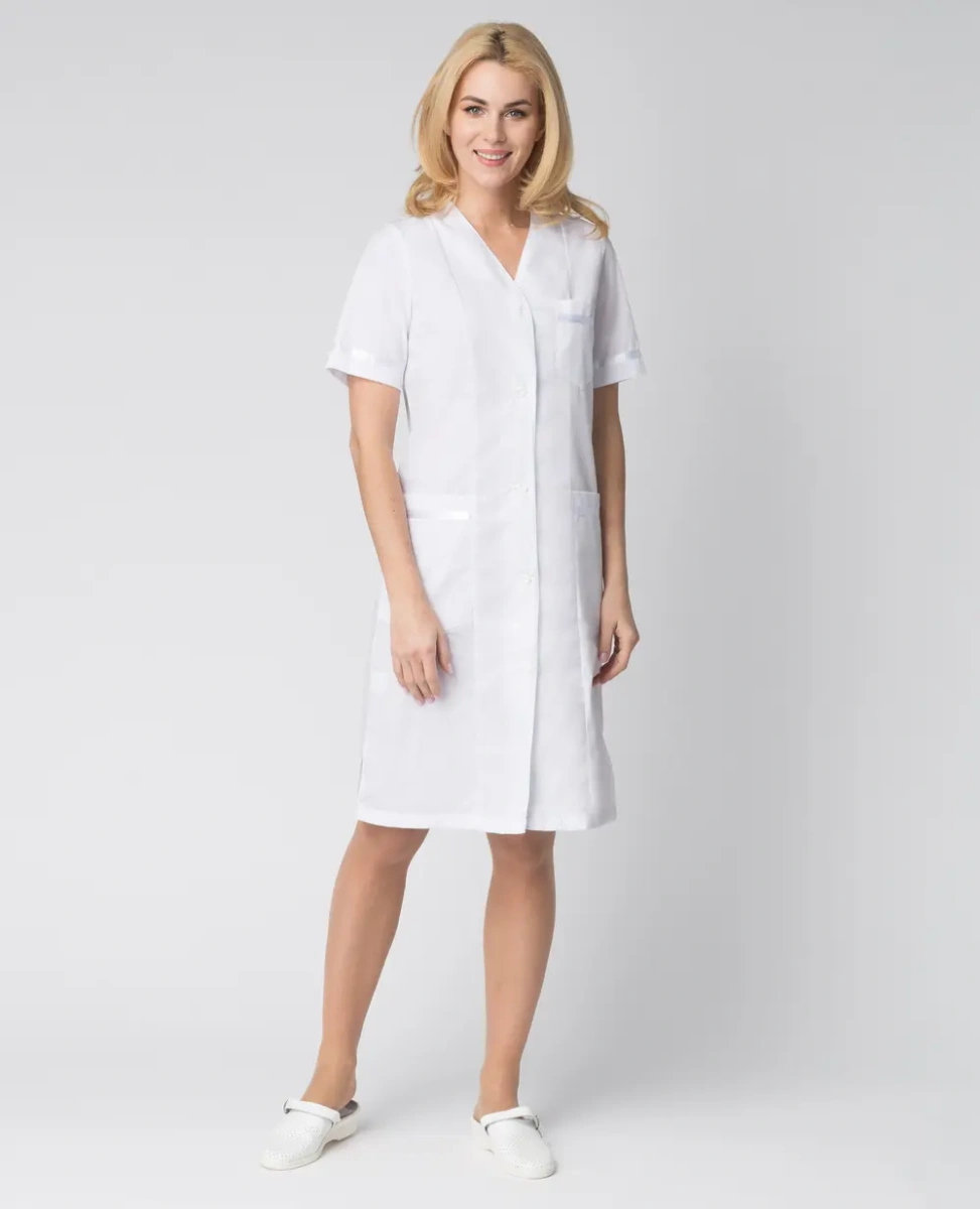 ОписаниеХалат женский «Светлана» изготовлен в соответствии с ГОСТ. Рабочая одежда удобного кроя из высококачественных материалов обеспечивает комфортную работу на производствах, в медицинских и образовательных учреждениях. Плотная ткань с водоотталкивающей пропиткой надежно защищает от загрязнений разного типа, отличается износостойкостью и длительным периодом эксплуатации. Халат белый рабочий дополняется вшивным поясом на кнопках, который подчеркивает и регулирует линию талии. Женский рабочий халат с коротким рукавом и длиной до колена отлично сидит по фигуре, не стесняет движения, выглядит модно и привлекательно. Халат застегивается на петли и пуговицы. В объемных боковых и нагрудном карманах удобно хранить записи и мелочи.