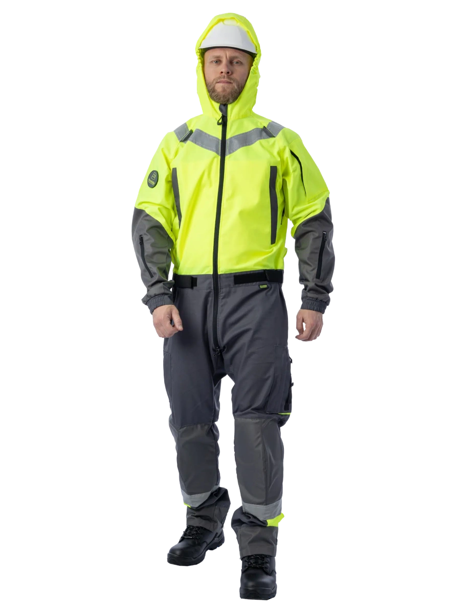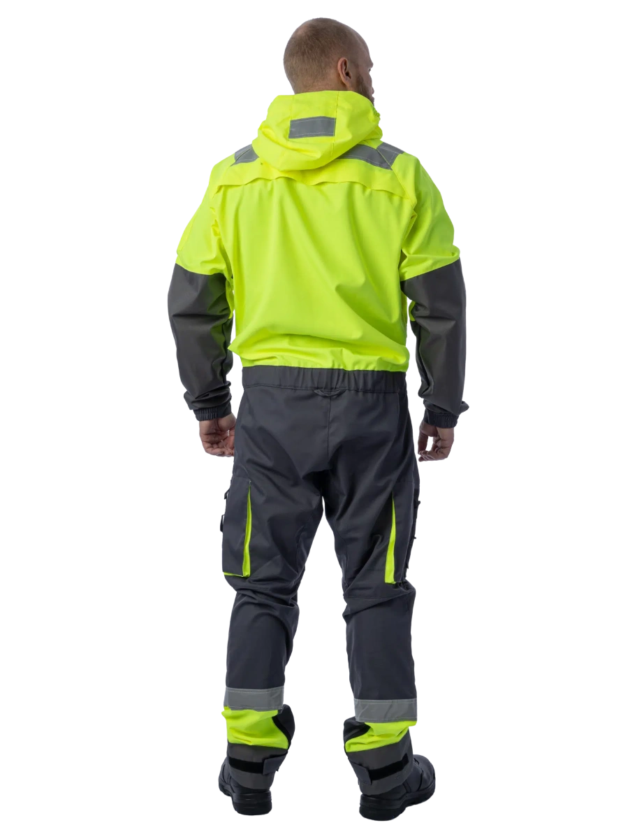 Устойчив к ОПЗ, лёгок в уходе Усиление износостойкой тканью задней части рукавов и коленей Область колен с мягкой амортизирующей прослойкой Двухзамковая центральная молния Капюшон регулируется, можно носить с каской Пояс спинки с эластичной тесьмой Вентиляционные молнии в подмышках, отверстия в области лопаток и паха Крой и детали учитывают возможность использования альпинистской обвязки Карманы на молнии, спроектированы под углом во избежание выпадения предметов на высоте 2 кармана на груди, 3 кармана на рукавах, 2 объёмных кармана на бёдрах, лента для крепления инструментов Манжеты рукавов на резинке Расширения на молниях внизу штанин для быстрого переобувания По низу брюк регулировка по объёму хлястиками на липучках Есть петля для рации В нагрудных карманах есть небольшая петля для крепления карабина Светоотражающие ленты 5 см и кант