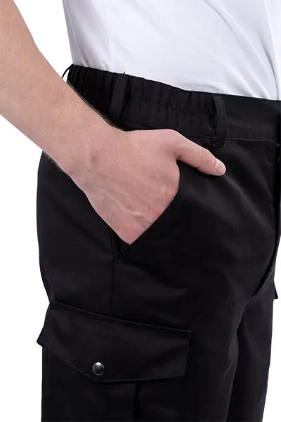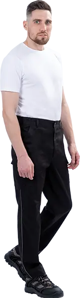 • пояс с эластичной лентой на участке боковых швов • застежка-гульф на тесьму-молнию • боковые карманы с наклонным входом на передних половинках • накладные карманы по боковым швам с клапаном с застежкой на кнопку