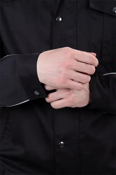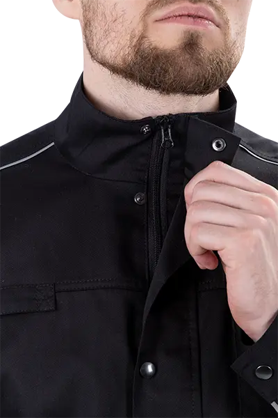 • петля под рацию на правой полочке • рукава с манжетами с застежкой на кнопку • воротник стойка • пояс куртки с эластичной лентой на участке боковых швов