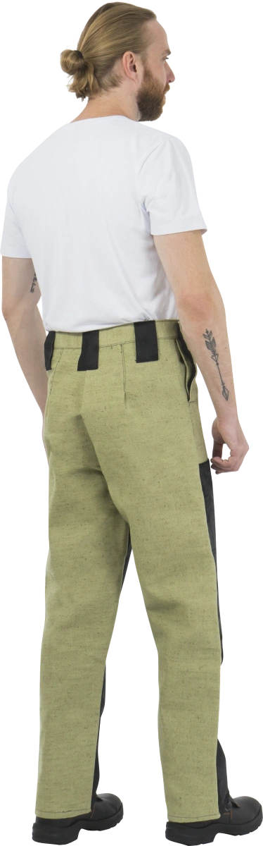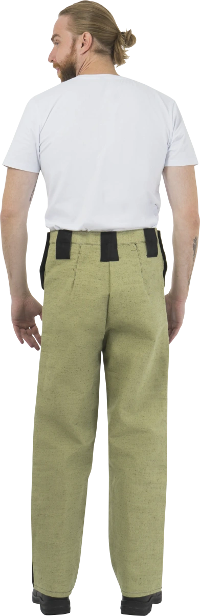 Задняя половинка брюк с притачным поясом, переходящим во внутренние хлястики с застёжкой на две обмётанные петли и одну пуговицы, тремя шлёвками, с вытачками по линии талии, с карманами в боковых швах с притачной подкладкой. Верхние срезы мешковины кармана входят в шов притачивания пояса задних половинок брюк. -