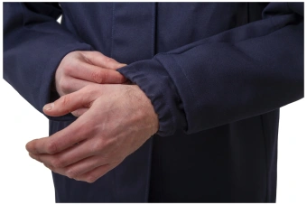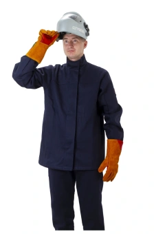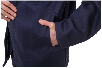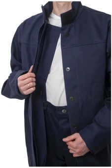 Куртка прямого силуэта, с правосторонней центральной бортовой супатной застежкой на 6 пуговиц С дополнительным внутренним защитным клапаном из основного материала, предохраняющим от попадания искр внутрь.