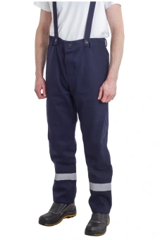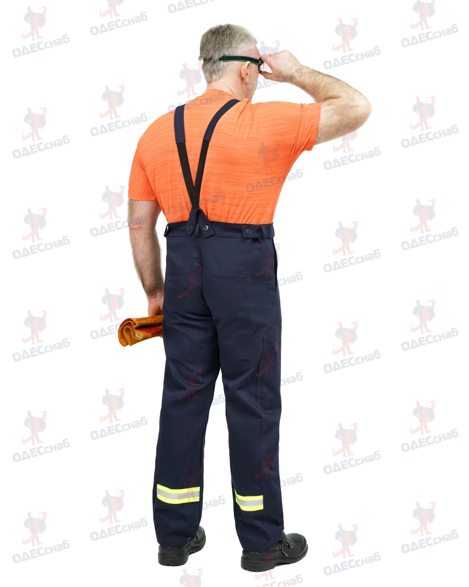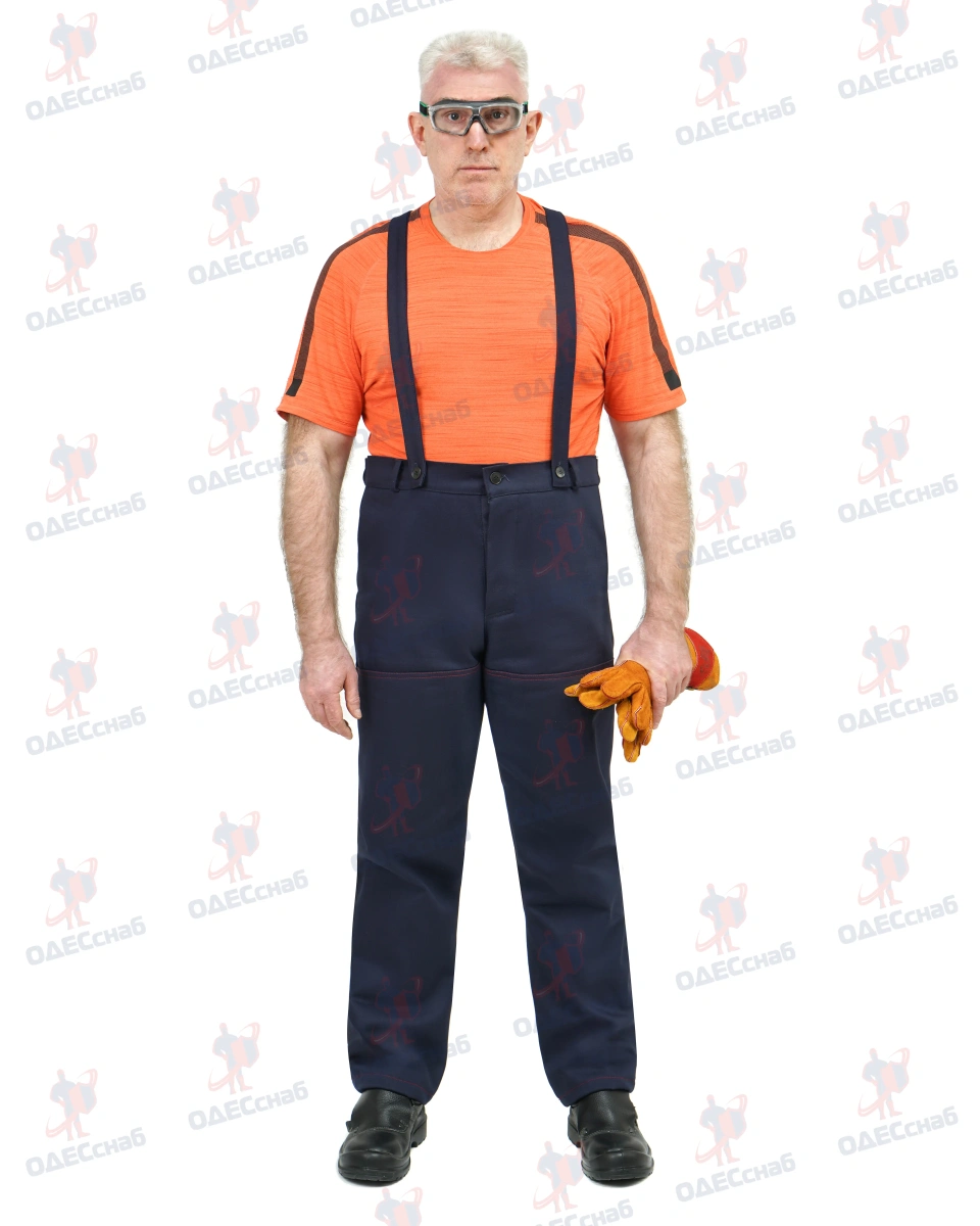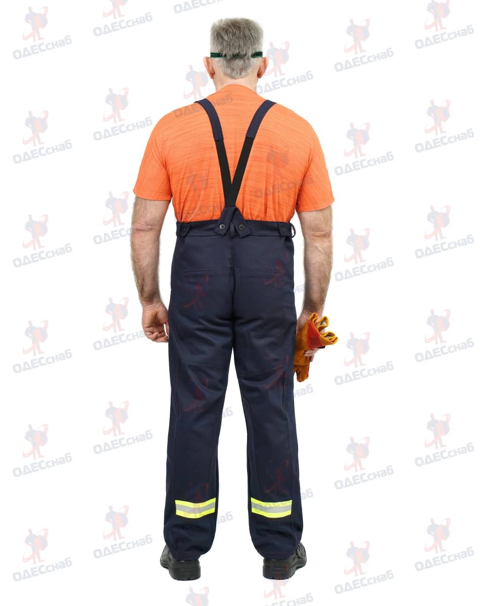 В брюках имеются накладки. На передних половинках брюк высота накладок от начала шагового шва и до низа брюк. На задних половинках брюк накладки располагаются по верху и низу , боковым и шаговым швам. В верхней части задних половинок брюк настрачиваются фигурные накладки ш. В брюках на задних половинках имеются нижняя накладкам, шаговая накладка , а так же боковая накладка. По низу брюк проходит СОП 50 мм из огнестойкого материала.