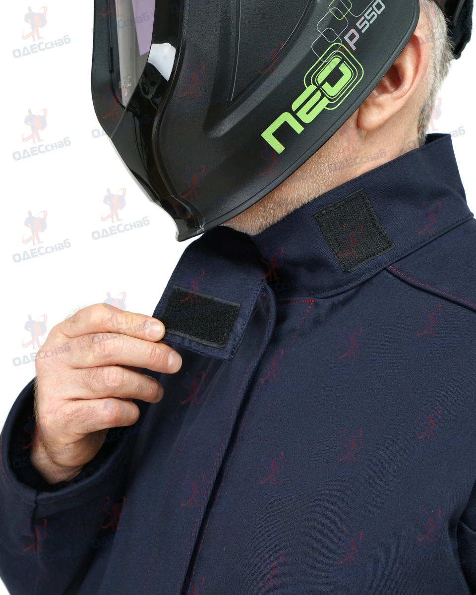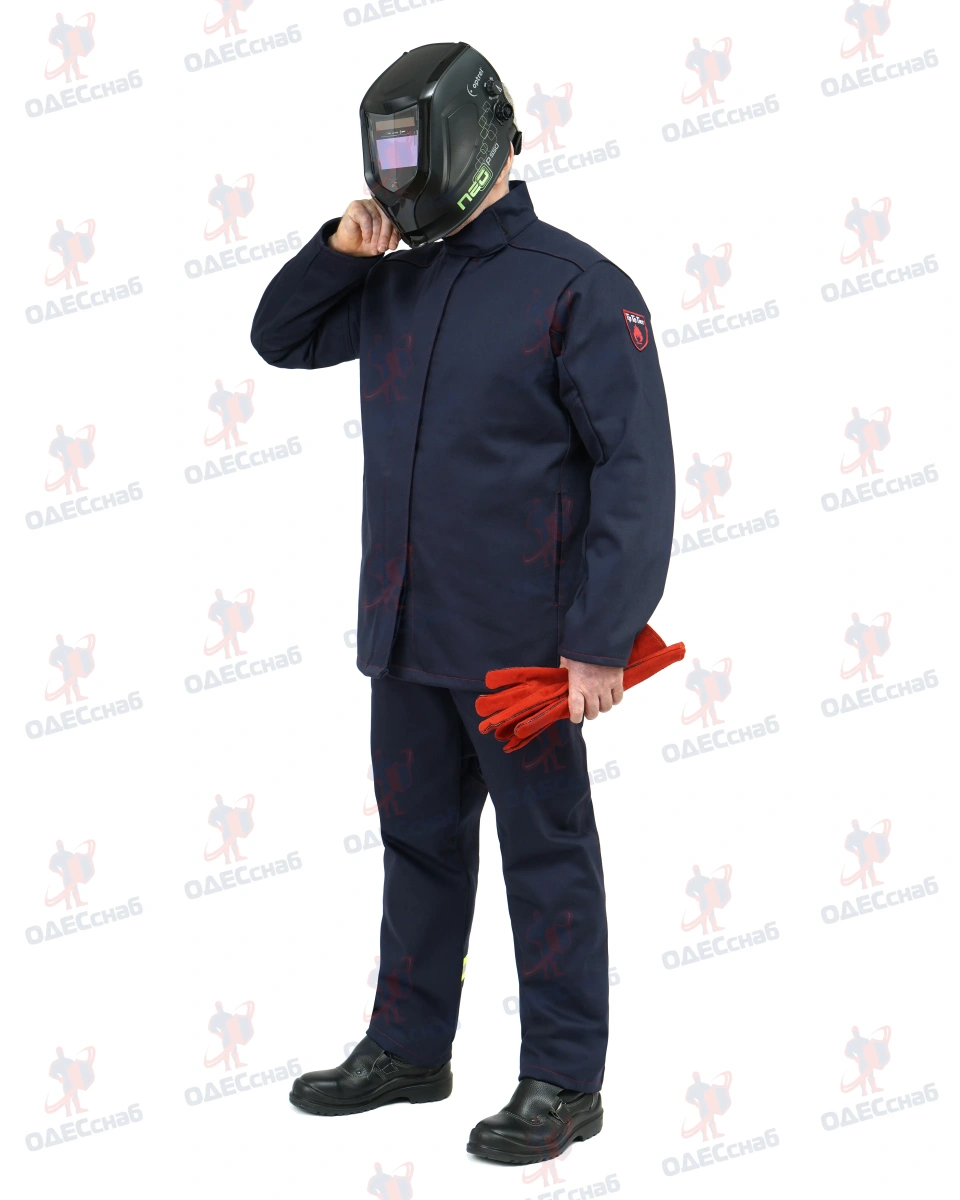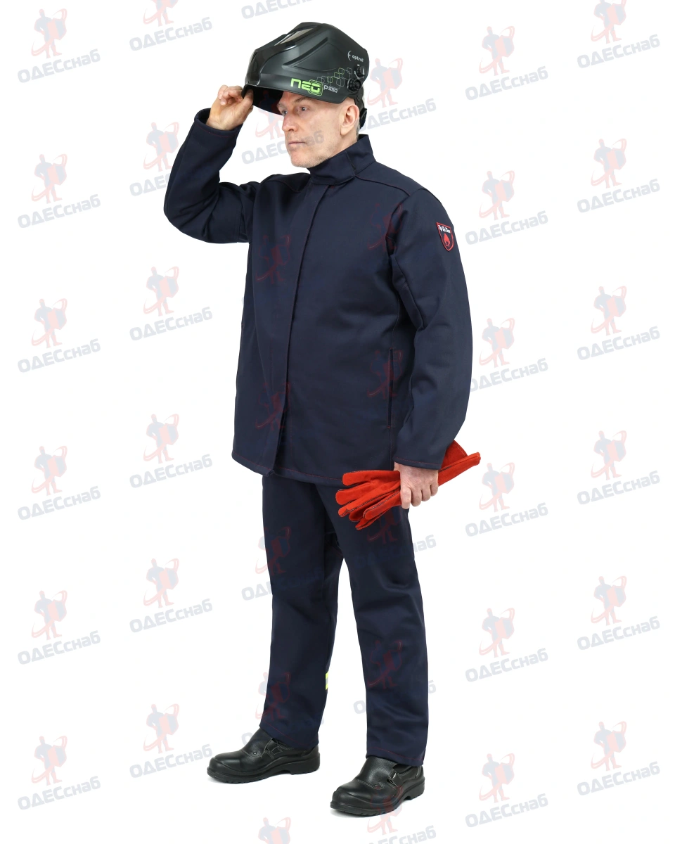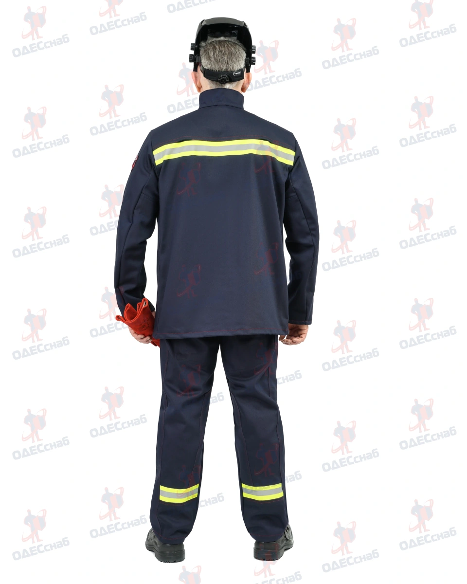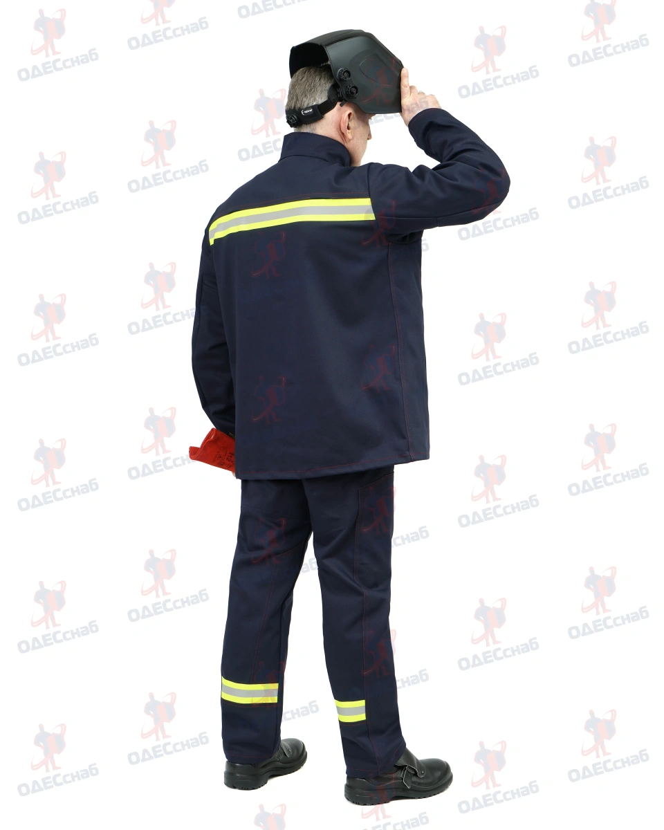 Костюм сварщика 100% х/б с огнестойкой отделкой ,тип защитной одежды – класс 3 ОНИКС 3 КОС 114 Костюм состоит из куртки и брюк. Костюм темно-синего цвета , со световозвращающими полосами серебристого цвета.