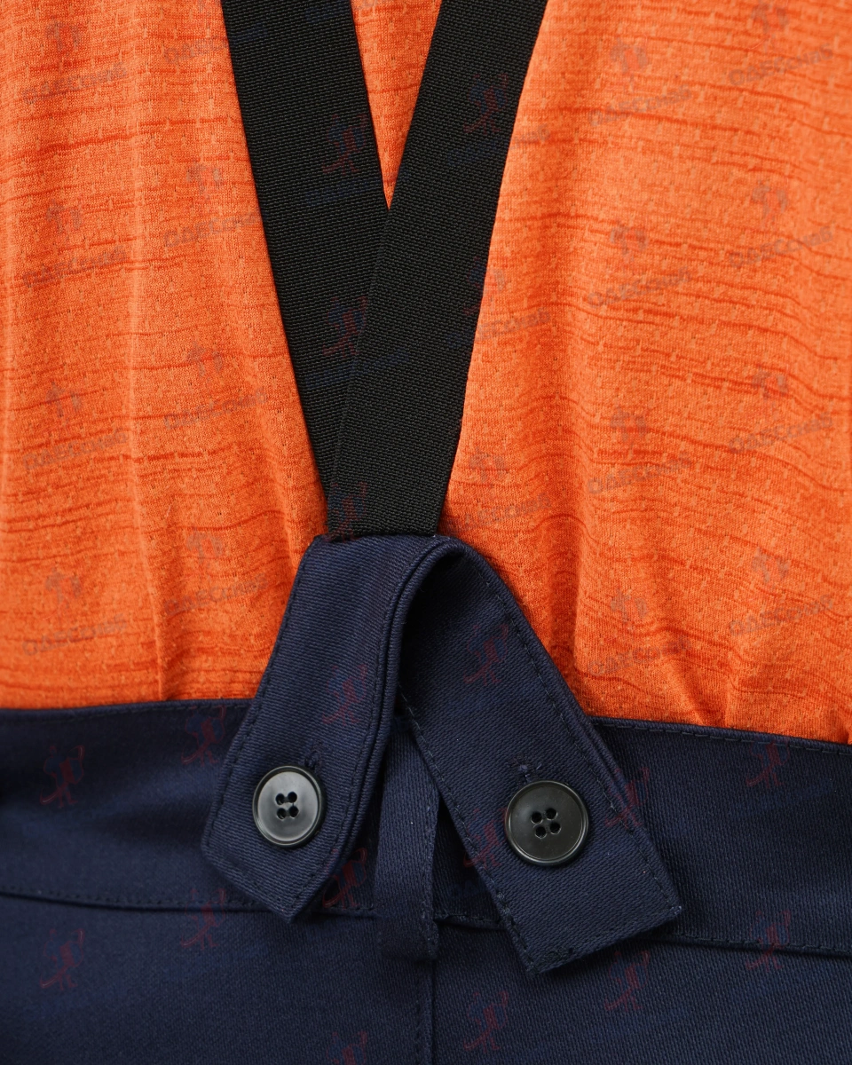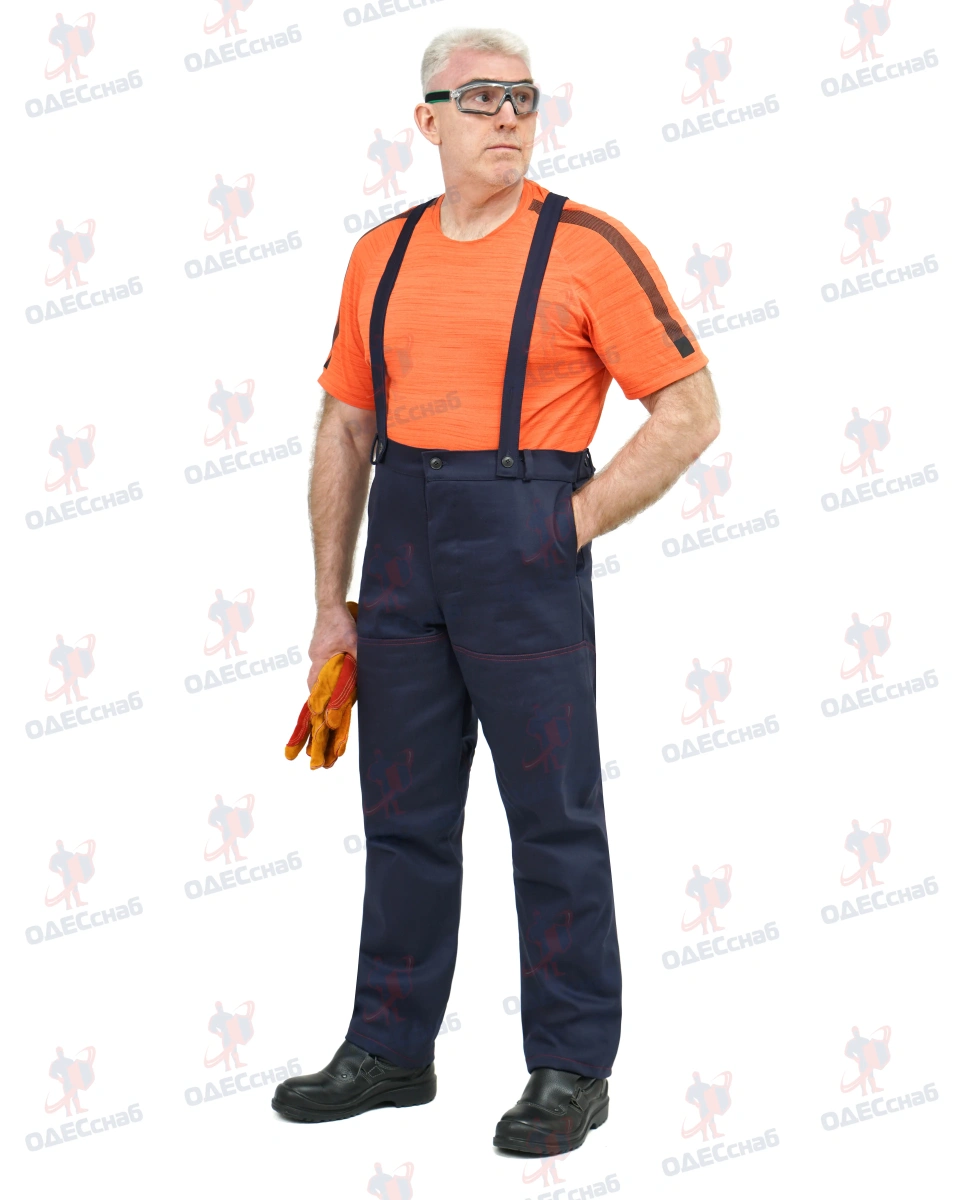 К поясу пристегиваются съемные бретели, бретели регулируются эластичной тесьмой, для удобства регулирования на бретелях имеются 2 обметанные петли. В шаговом шве расположены вентиляционные отверстия в виде обметанных петель.