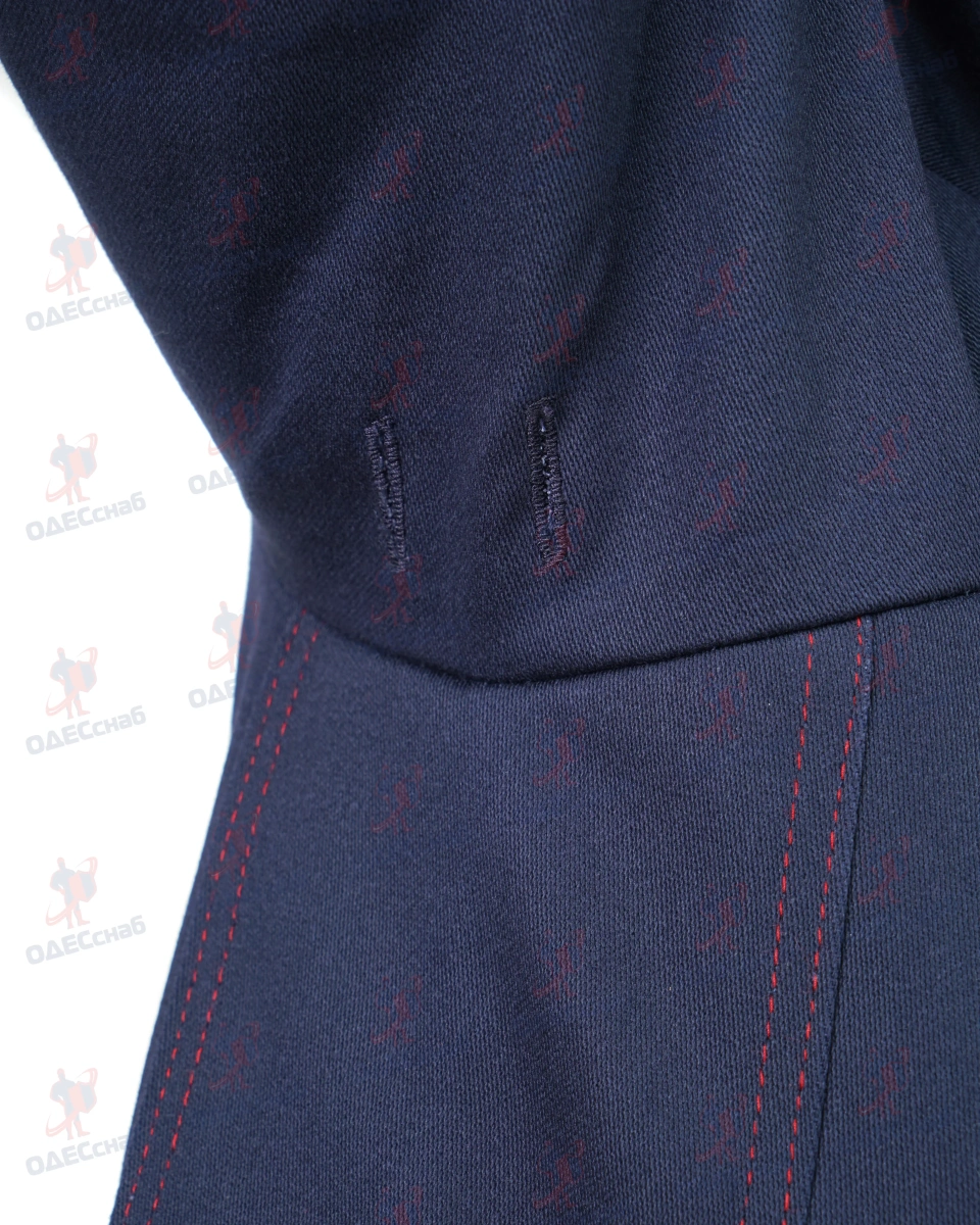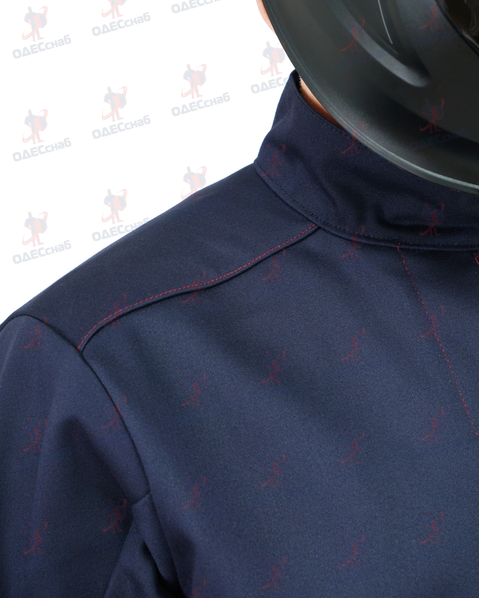 Полочки с кокеткой, в рельефном шве полочек располагаются карманы. Верхний и нижний край кармана продублирован закрепкой. На левой полочке – внутренний карман для документов из основного материал Рукав имеет накладки по всей средней части рукава, а так же имеет нижнюю накладку внутренней части рукава. В нижней части проймы вентиляционные отверстия с обработкой петля, низ рукава с напульсником из огнестойкого материала, стянутым эластичной тесьмой. . На левом рукаве настрочен шеврон Тр, Ти. Шеврон изготавливается из основного огнеупорного материала. Воротник по типу стойки.