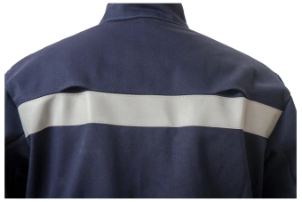 Костюм состоит из куртки и брюк. Костюм темно-синего цвета , со световозвращающими полосами серебристого цвета.