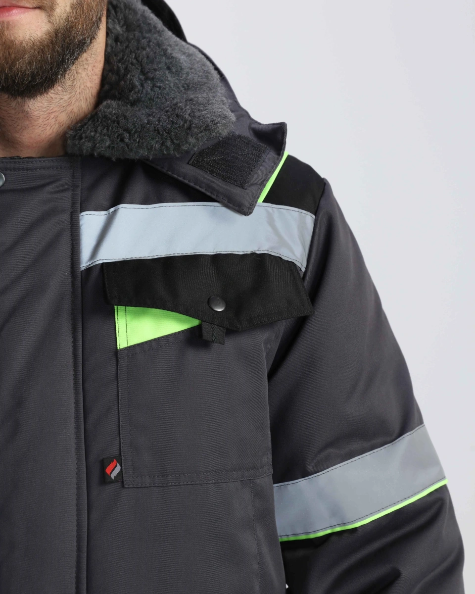 - с нагрудными карманами с клапаном на кнопках и нижними карманами в швах, с регулировкой объёма по низу куртки