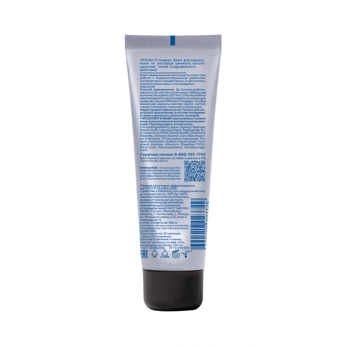 Крем для защиты кожи гидрофобного действия гипоаллергенный, подтверждено клинически. Не содержит силиконов, парабенов, красителей. Средство стабильно при замораживании и нагревании от -45 С⁰ до +40 С⁰. Подтверждено Испытательным аккредитованным центром.
