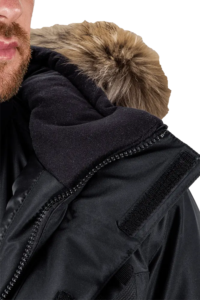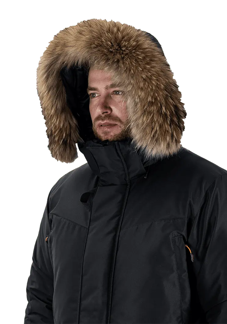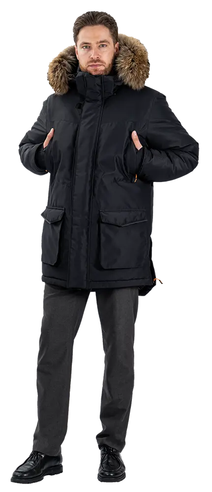* Отстегивающаяся опушка из натурального меха енота на капюшоне.
