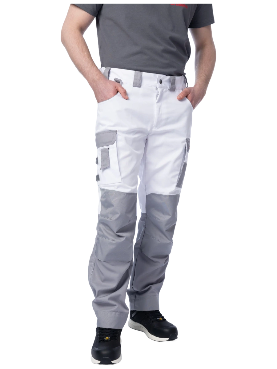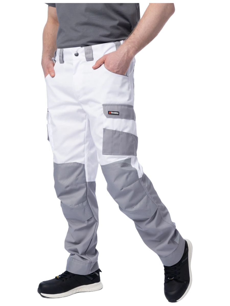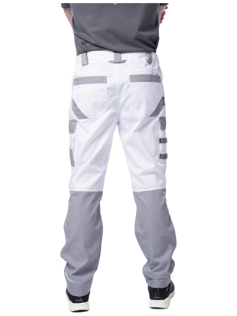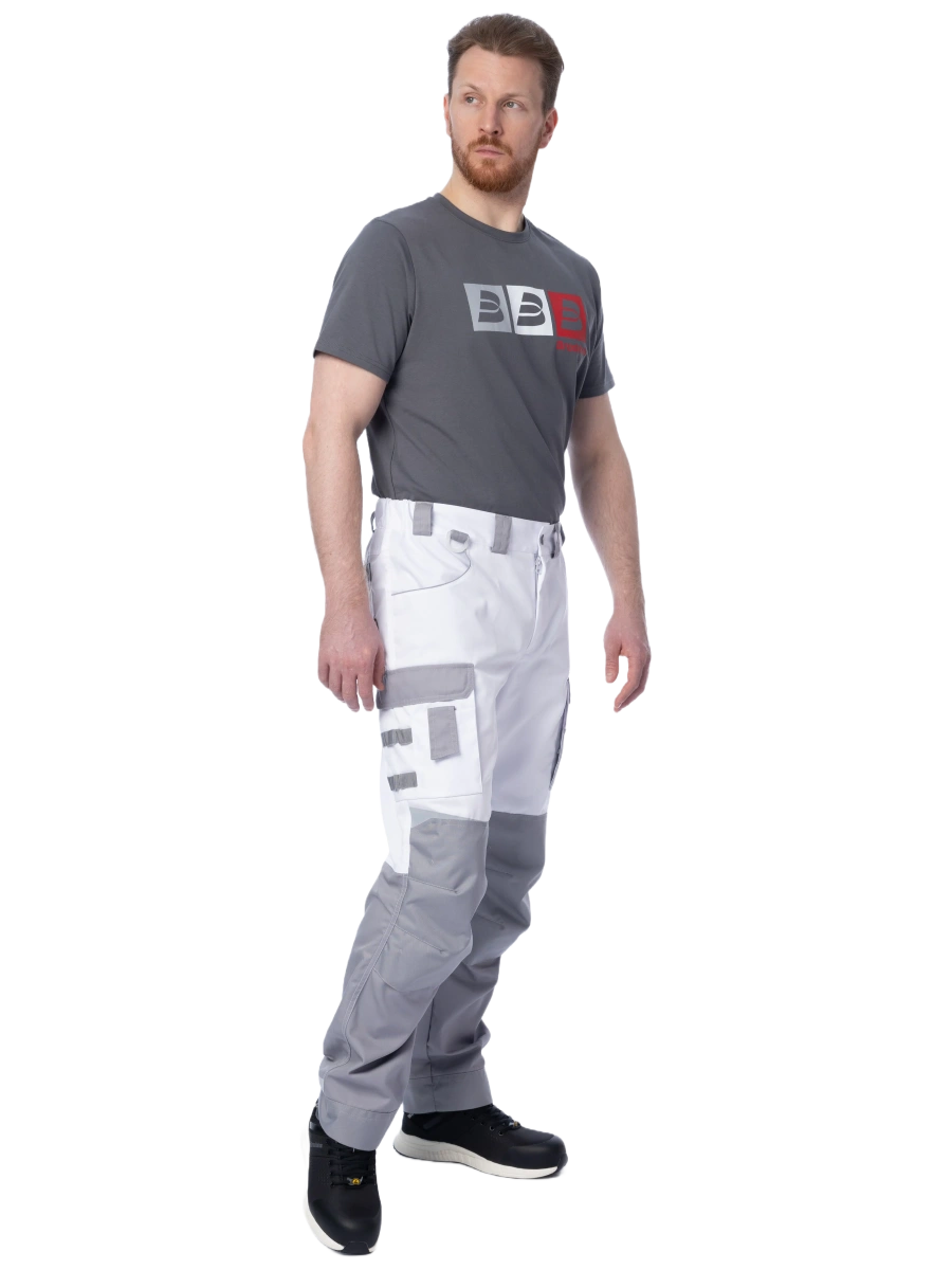 ОписаниеБрюки мужские летние Brodeks KS 302, белый/серый – практичные брюки для работы в помещении или на улице летом. Хорошо защищают от общепроизводственных загрязнений. Брюки белого цвета с серыми вставками идеально подойдут для выполнения малярных работ, и особенно для работы в условиях сильной жары и яркого солнца.
