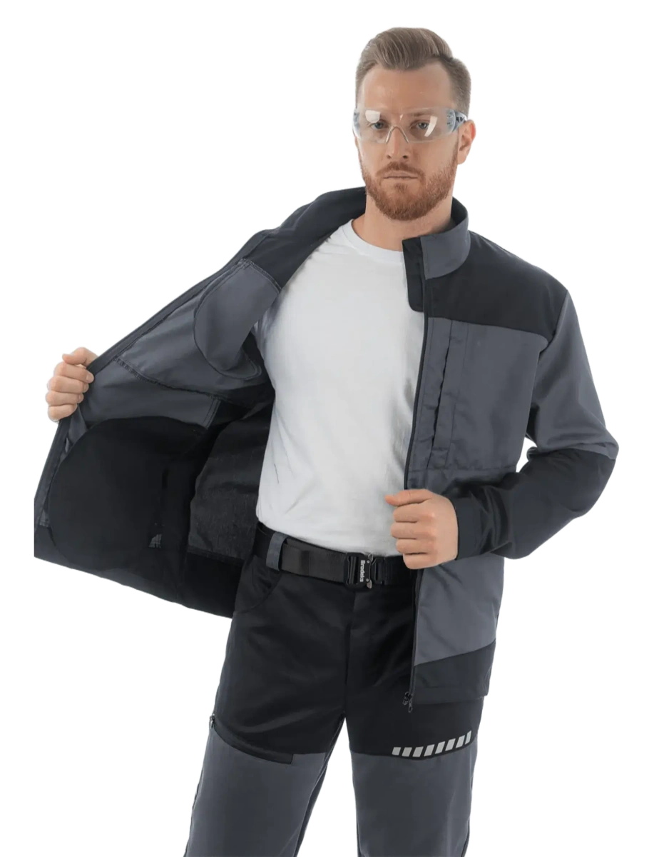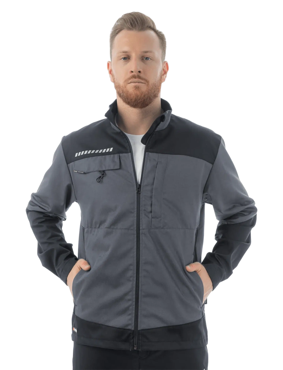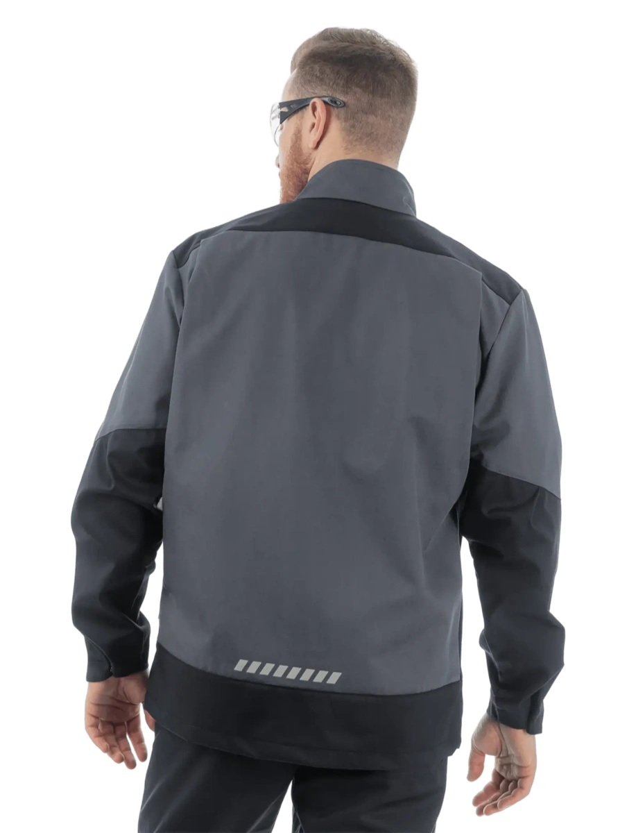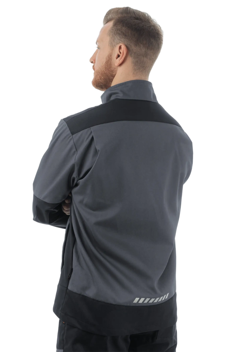 Воротник-стойка Центральная молния с подпланкой Манжет рукава с регулировкой Вентиляция в области подмышек Складки в области лопаток для свободы движений 4 кармана Карабин для ID/бейджа Светоотражающие элементы