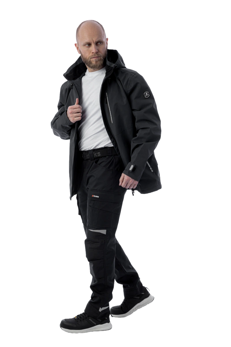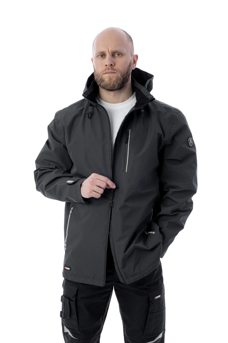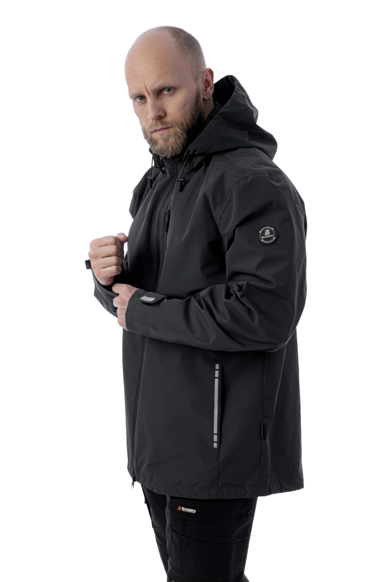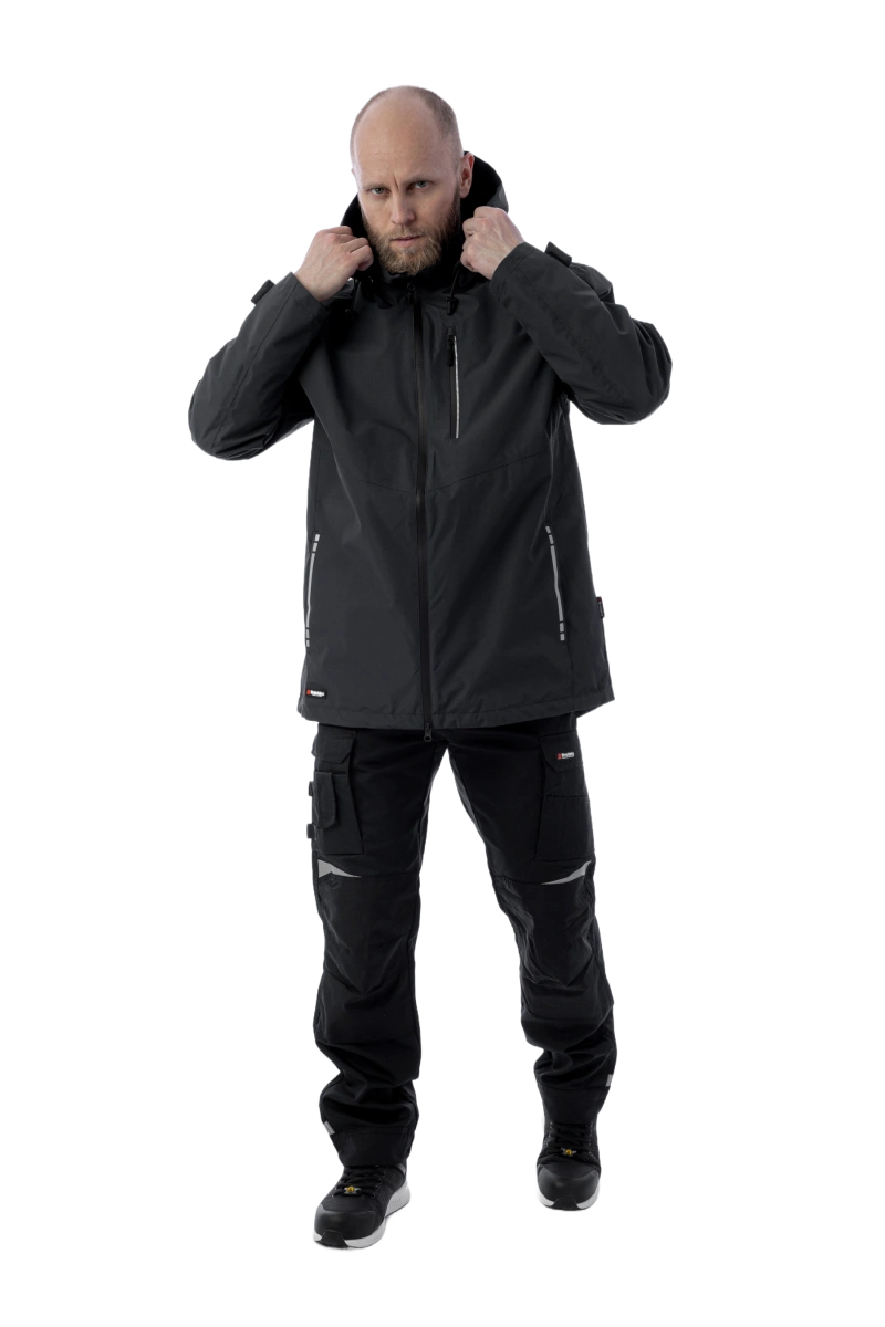 Защита от дождя и ветра (10 000 мм) Высокая паропроводимость (10 000 г/м2/24 часа) DWR-пропитка Сетчатая подкладка Капюшон отстёгивается и регулируется, можно носить с каской Регулировка объёма куртки по низу изделия эластичным шнуром Основные швы герметизированы Влагозащитные молнии 5 карманов Светоотражающие элементы
