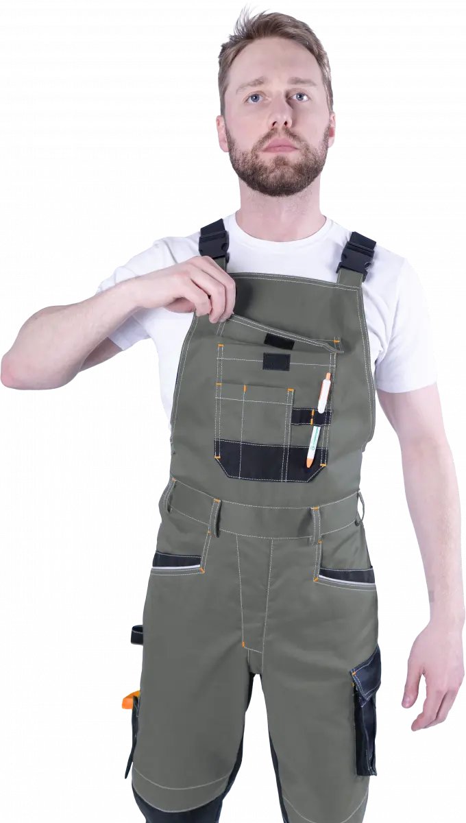 • с отрезным нагрудником, с вместительным накладным карманом с клапаном на ленте-контакт