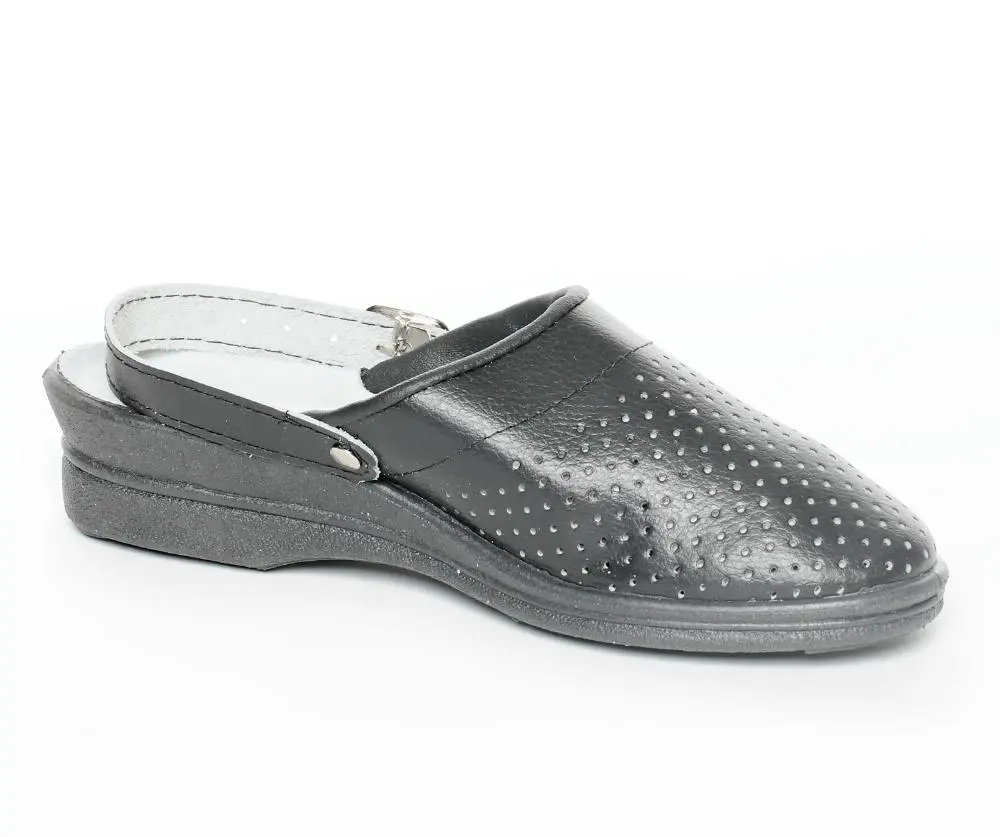 ОписаниеПерфорированная кожа в женских сабо создает дополнительную вентиляцию. Поворотный регулируемый ремешок может располагаться спереди и сзади, для фиксации пятки и декоративного элемента на изделии. Удобная модель предназначена для использования в сфере обслуживания, легкой промышленности, медицины.
