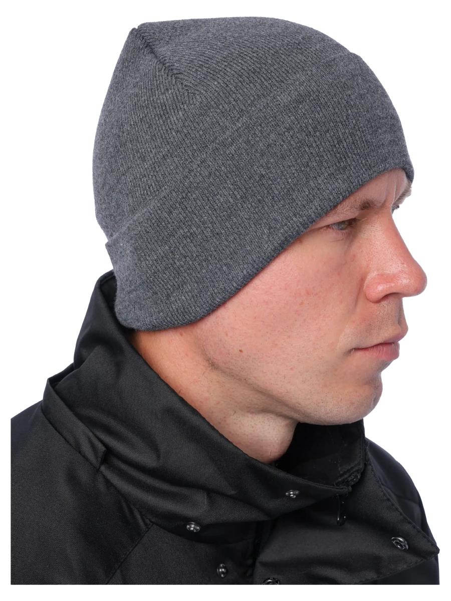 Наружное акриловое трикотажное полотно. Плотная вязка сохраняет форму. Хорошо облегает голову. Можно носить в двух вариантах – с отворотом и без него. Размер: 56 см.