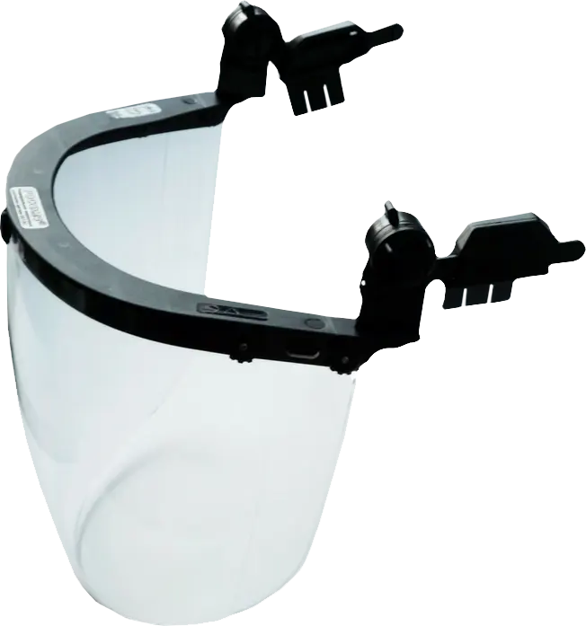 Скошенная книзу форма для увеличения эргономики изделия. Крепление щитка к защитной каске осуществляется за счет поворотно-фиксирующего устройства, изготовленного из термостойкого материала, устойчивого к износу и гарантирующего надежную фиксацию лицевого щитка в двух положениях «вверх-вниз». -