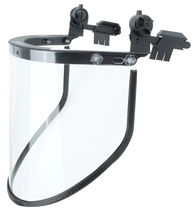 • крепление щитка к защитной каске осуществляется за счет подъемно-фиксирующего устройства, устойчивого к износу и гарантирующего надёжную фиксацию лицевого щитка в двух положениях “вверх-вниз”.