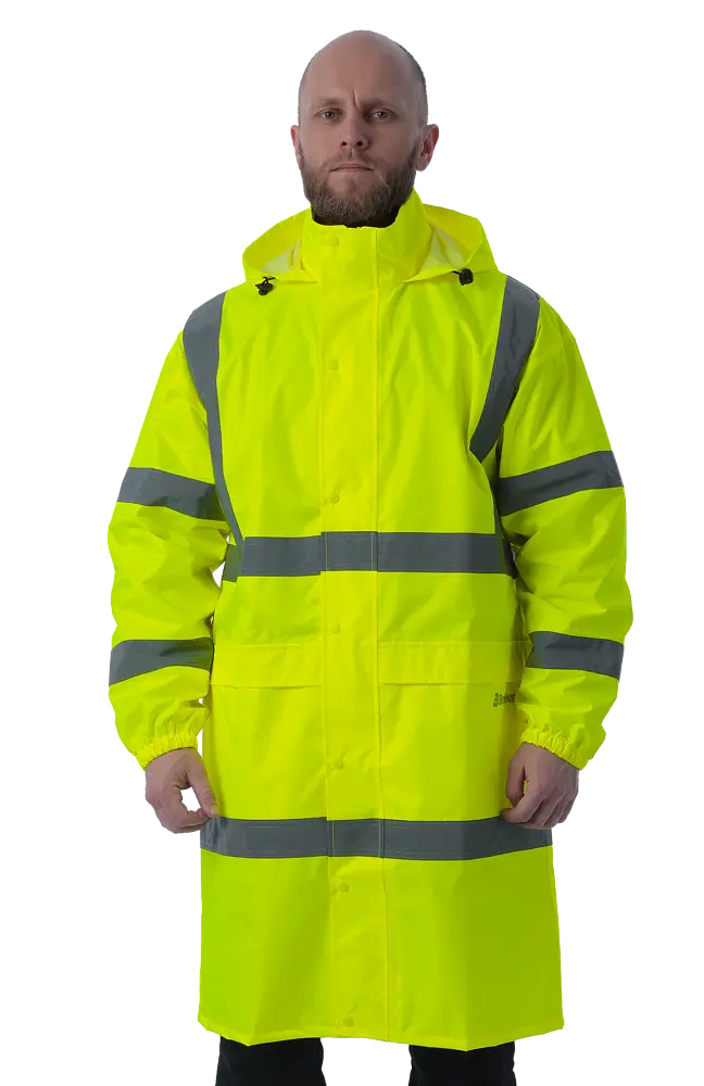 3 класс повышенной видимости PU отделка СВ ленты шириной 50 мм Швы с герметизацией 2х замковая молния Воротник-стойка с карманом для капюшона Накладные карманы закрыты планками Люверсы для вентиляции Доступно в размерах от S до 4XL