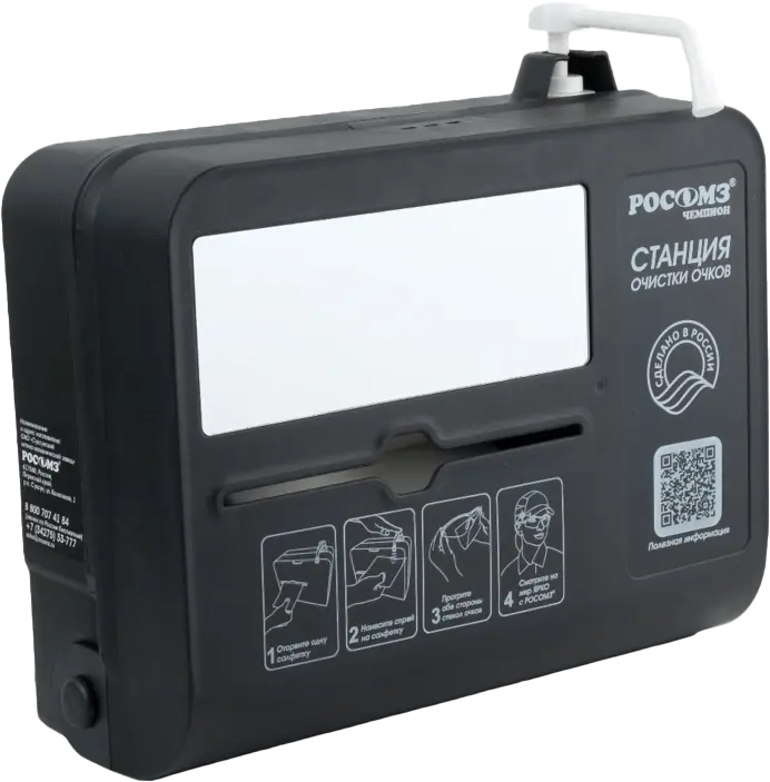 ОписаниеСтанция для очистки очков любого типа от пыли, отпечатков пальцев, жирных пятен и других загрязнений.