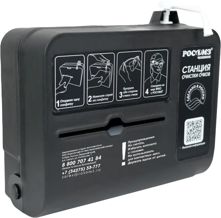 ОписаниеСтанция для очистки очков любого типа от пыли, отпечатков пальцев, жирных пятен и других загрязнений.