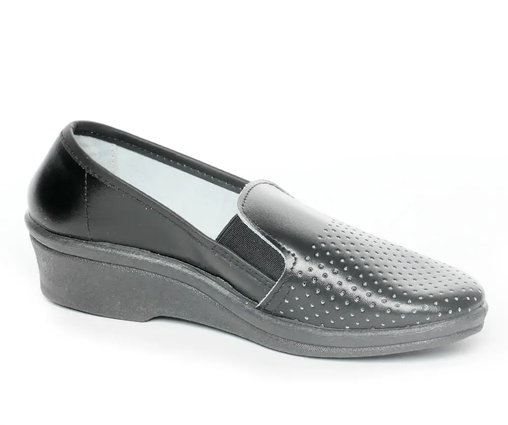 ОписаниеЖенские туфли изготовлены из перфорированной кожи для улучшения вентиляции. Удобная модель предназначена для использования в сфере обслуживания, легкой промышленности, медицины.