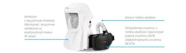 Маска имеет панорамное защитное стекло и регулируемое оголовье с мягкой налобной накладкой. В состав блока подачи воздуха входит вентилятор с двумя режимами работы 170л/мин и 210 л/мин, съемный литий-ионный аккумулятор, который обеспечивает более 9 часов автономной работы при выбранном режиме 170 л/мин, ремень с помочами, шланг подачи воздуха с резиновыми уплотнителями, для предотвращения подсоса неочищенного воздуха. Снаружи шланг покрыт защитной тканью, которая защищает его от возможных механических воздействий во время работы оператора. Блок регулируется нажатием всего одной кнопки (включение, выключение, переключение скорости работы вентилятора). На блоке есть индикатор загрязнения фильтра, индикатор уровня заряда батареи. Когда уровень заряда батареи или уровень загрязнения фильтра становится критически низким, блок издает циклический громкий звуковой сигнал и вибрирует.