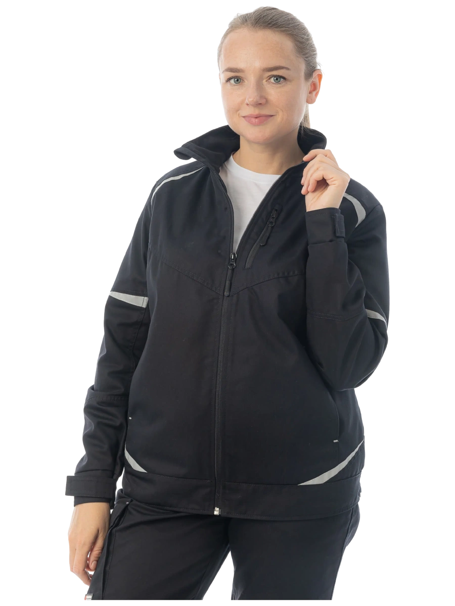 Лёгкая в уходе, износостойкая Крой учитывает особенности женской фигуры 5 карманов: 2 боковых кармана, 1 нагрудный на молнии, 2 внутренних Низ куртки и рукавов регулируются Светоотражающие элементы