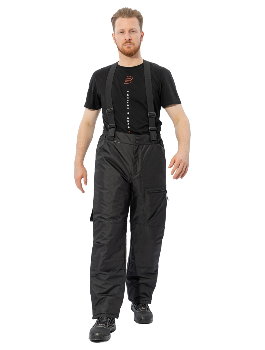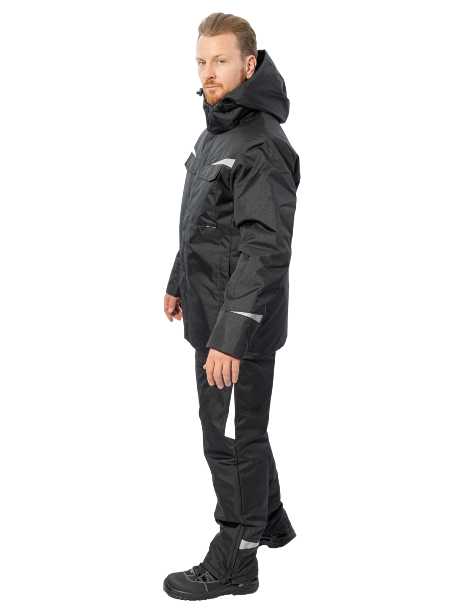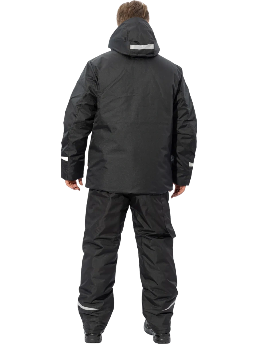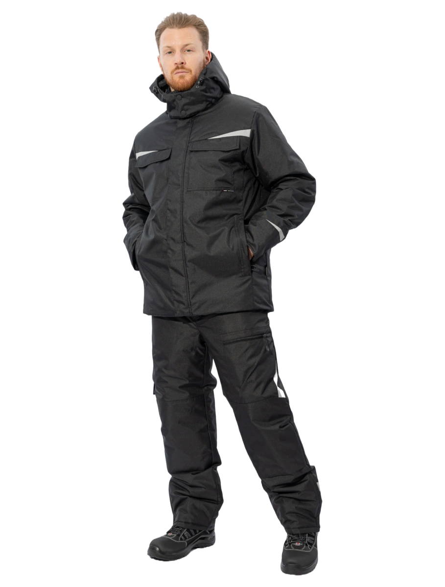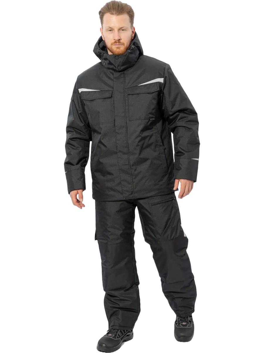 Куртка: Двухзамковая молния Ветрозащитная планка Высокий воротник с подкладкой из микрофлиса Внутренние трикотажные манжеты Капюшон на каску, съёмный, с регулировкой объема Стёганая подкладка 7 карманов: два нижних на молнии для рук, два нагрудных с клапанами, большой внутренний для документов, один накладной, один на молнии Световозвращающие элементы Брюки: Завышенный пояс на спине Эластичная резинка по бокам в поясе Съёмные подтяжки и спинка с подкладкой из микрофлиса Широкие шлёвки под ремень с удобным креплением для подтяжек Анатомически скроенные колени Отделения под наколенники с нижней загрузкой Молнии по низу брюк для регулировки объёма и быстрого переобувания 6 карманов: два для рук, два задних, набедренный объёмный на молнии, накладной карман для инструментов с двумя входами Петля для подвеса инструментов Световозвращающие элементы