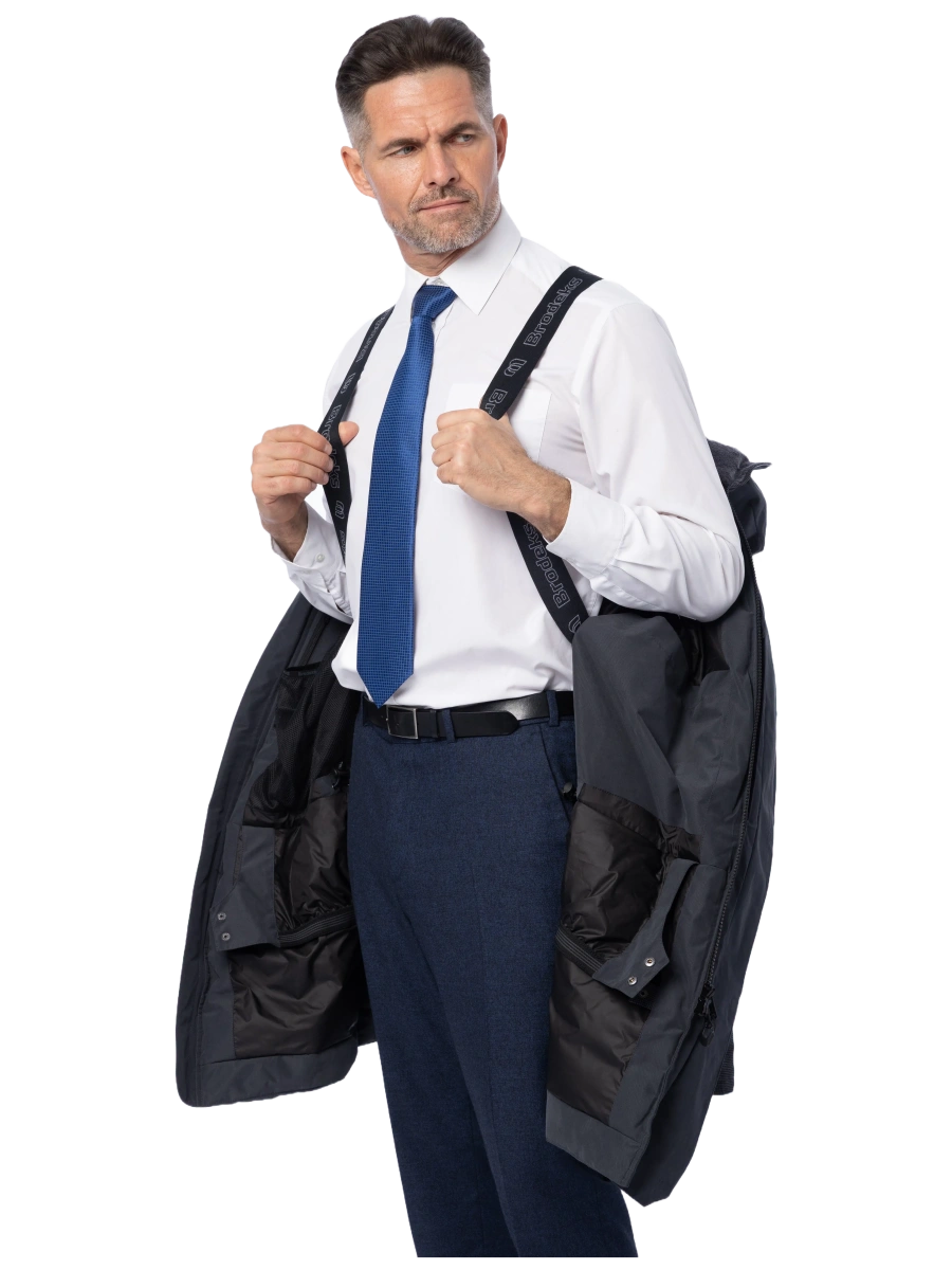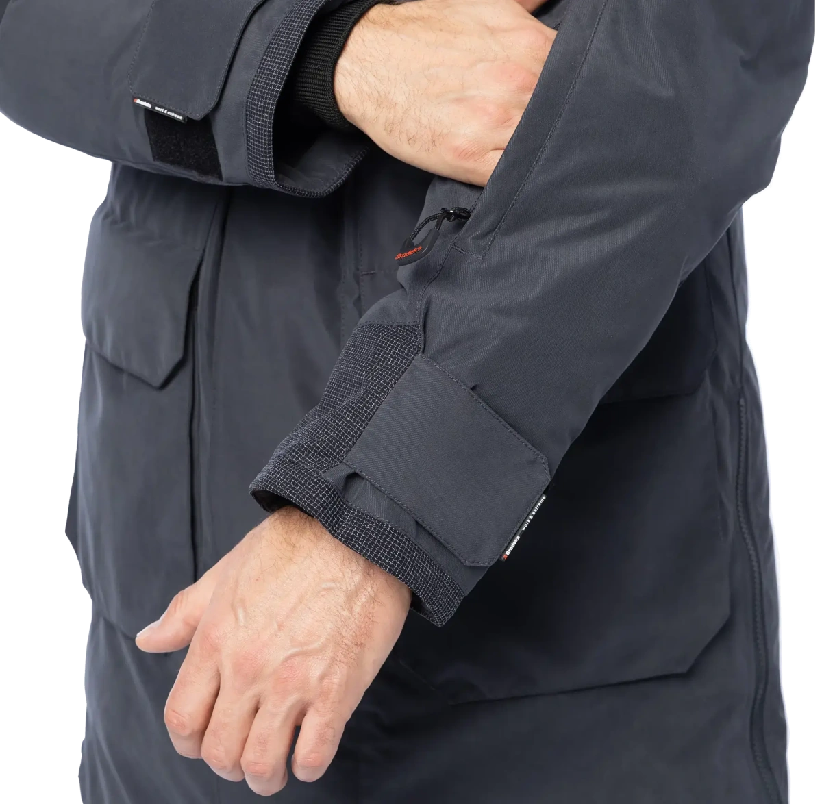 Длинный прямой крой Температура комфорта: от -25°C до -42°C Не промокает и не продувается Центральная молния расстёгивается сверху и снизу Высокий воротник Несъёмный капюшон, регулируется Утяжка в талии 6 наружных карманов на магнитах, потайной карман для планшета под центральной планкой, карман для пропуска на рукаве, а также внутренние карманы для документов и гаджетов Ветрозащитная планка и подпланка Молнии в боковых швах для дополнительной свободы движения и/или комфортного вождения автомобиля СВ-элементы темного цвета Мембрана 10000/10000